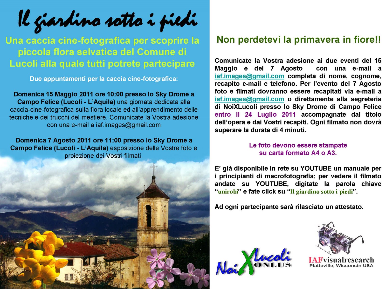 Il 15 maggio p.v. con appuntamento alle ore 10.00 a Campofelice presso lo Skydrome, si realizzerà, tra tutti gli iscritti all’iniziativa convenuti, un’escursione guidata con finalità didattiche alla ricerca dei fiori da fotografare. Questa iniziativa nasce dalla nostra finalità sociale di richiamare turismo ed attenzione per Lucoli e non ha scopo speculativo nè di lucro, i partecipanti si riuniranno presso il ristorante che metterà a disposizione gli spazi per le proiezioni delle foto “cacciate” nel corso della seconda sessione del 7 agosto p.v. in questa circostanza le foto ed i filmati saranno commentati da esperti botanici. I materiali prodotti verranno utilizzati per realizzare un servizio sulla flora del territorio. Per tutti i principianti è già disponibile su Youtube un demo video che illustra i trucchi del mestiere riguardanti la macroripresa. Alla demo si può accedere con la parola chiave UNIROBI in Youtube, dove tra gli altri filmati IAF photoarchive, si potrà trovare anche il GIARDINO SOTTO I PIEDI. (http://www.youtube.com/watch?v=ewoFCFmM9K0 link per il giardino).