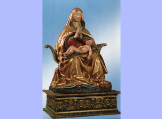 La preziosa scultura in terracotta, policroma e dorata, è attualmente collocata in Cornu Evangeli nella chiesa ma proviene da altro sito non individuato. L’attuale sistemazione, risalente forse ai primi decenni del ‘900 ha comportato un montaggio assolutamente improprio che ne ha addirittura alterato le dimensioni e la postura e stuccato le mancanze e coperto le cromie più antiche con malte di gesso e colate di cera pigmentata. Il restauro del 1997, dopo lo smontaggio dalla sede, ha ricomposto tutte le parti sostenendole con un traliccio inox interno, consolidato la terracotta, rimosso le ridipinture e recuperata la delicatissima cromia dei carnati e le preziose dorature.