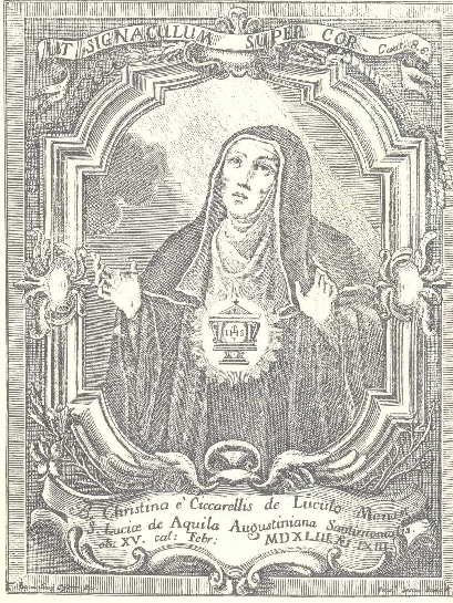 ANTINORI, A., Vita della Beata Cristina da L’Aquila, Roma 1740; Sacra Rituum Congregatione. Aquilana super approbatione cultus praestiti B. Christinae a Lucolis, Romae 1839; CREMONA, C., La b. C. de L’Aquila, agostiniana, Roma 1943; DURANTE, M., La stella di Lucoli. Breve vita della b. C. da Lucoli, L’Aquila 1943; FALCIONI, D., OSA. Beata Cristina da L’Aquila, beata, in Enciclopedia Cattolica, Città del Vaticano 1950, 915; CURTIS, C., OSA., Vita della Beata Cristina da L’Aquila. L’Operetta fu stampata a Colonia nel 1636, L’Aquila 1991; ID., Beatae Christianae vita. Testo latino – traduzione a fronte. A cura di Antonio Cordeschi, L’Aquila 1993.