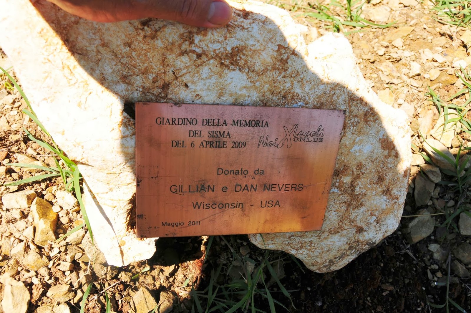 A light rain fell, the sky was grey and clouds hung low over the mountains as the three of us traversed, from different directions, the young orchard. We were in no hurry; we knew that we would eventually find “our” tree. When we did find it, I was delighted that it was a pear tree — a Williams pear. The tree was planted no more than three years ago, but it already bore several pears. I looked down to read the plaque at its base and found a small, yellow pear on the ground. A sweet spot of color in the otherwise dark day. I put the pear in my pocket and carried it with me for the rest of our stay in Italy, hoping it would ripen before we had to leave for Wisconsin. It never did ripen, but knowing that I wouldn’t be able to get it through customs, the night before we flew home I ate it anyway. It was hard and slightly bitter. The earthquake that devastated the region April 6, 2009 was hard and bitter. It takes time for sweetness to find its way back into a world that has been hit by great tragedy. The “Giardino Botanico della Memoria” is a place where, I believe, people will come and remember and find a way to let sweetness return to their lives.