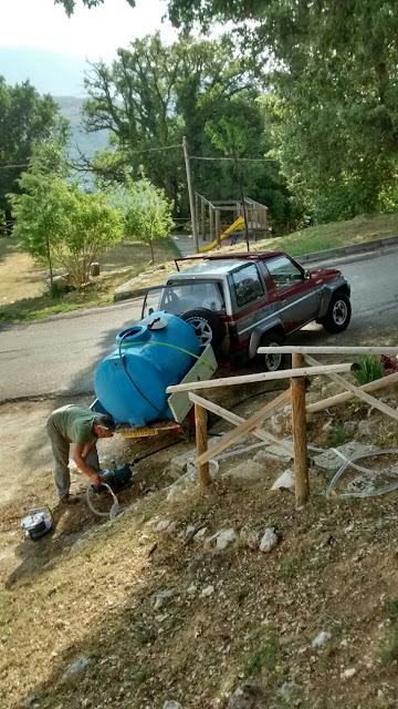 Sembra che il Cristo dall’alto ci guardi in queste operazioni laboriose che compiamo una volta a settimana per dare l’acqua, in giornate caldissime, alle nuove piante del Parco della Rimembranza di Lucoli: l’impegno è di due ore di tempo. L’acqua è presa dalla fontana della Beata Cristina e portata con un serbatoio mobile all’Abbazia dove viene ricaricato un altro serbatoio fisso.