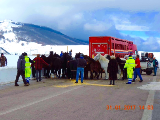 Una gigantesca operazione di polizia veterinaria aquilana e marsicana per recuperare i cavalli che pascolavano sul territorio di Lucoli allo stato brado. Questi cavalli, più che bradi, oserei definirli oramai selvatici. Il branco, più volte è stato indirizzato verso Rosciolo dagli stessi proprietari ma sistematicamente e velocemente, essi sono tornati sui pascoli dell'altopiano. Molti dei giovani equini, sono nati e cresciuti sui nostri pascoli e quindi si presume che siano anche privi di microchip. Anche per questo, le operazioni di carico, sono state stressanti ed impegnative per gli stessi proprietari, nonostante la collaborazione di altri allevatori locali. Il personale ANAS ha chiuso a momenti alterni, il traffico per oltre 4 ore con la partecipazione di varie forze di polizia, mezzi spazzaneve, motoslitte e ca. uomini addetti all'operazione. Nonostante questo dispiegamento impressionante di forze, tre cavalli molto vigorosi, si sono rifiutati di salire sui mezzi. Verranno in ogni caso, nutriti e recuperati appena possibile dai proprietari. Ovvio che l'Amministrazione Comunale di Lucoli ha dichiarato guerra al pascolo abusivo, incontrollato e pericoloso. Entro il periodo necessario per sistemare le pratiche burocratiche, il fenomeno verrà debellato radicalmente.
