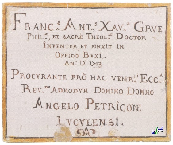 Parliamo del “Paliotto di Lucoli” oggi parzialmente conservato nei depositi del Museo Nazionale d’Abruzzo (Le Ceramiche di Castelli Museo Nazionale d’Abruzzo, catalogo a cura di C. Tropea e E. Amorosi, Paleani Roma 1986, pp 50-63). Quest’insieme comprende una mattonella interamente occupata d auna lunga dedica: Franc.s Ant. s Xav. S Gruel Phil.ae, et Sacrae Theol.ae Doctor/inventor, et Pinxis in Oppido Buxi/An° D.i 1713/Procurante pro hac Vener.li Ecc.a/Rev. Do Admodum/Domino Domno/Angelo Petricone/ Luculensis.