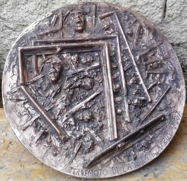 In questa scultura l’artista ha cercato di immortalare plasticamente tre sequenze in rapida successione: ci sono infatti gli stipiti di una finestra negli attimi del crollo, tre volti di un bambino nel momento del sonno, del brusco risveglio e del dramma. E’ anche raffigurato l’urlo della madre, consapevole della tragedia che si sta consumando. Sono raffigurati elementi lignei spezzati, presenti nel centro storico di l’Aquila insieme a particolari decorativi medievali.