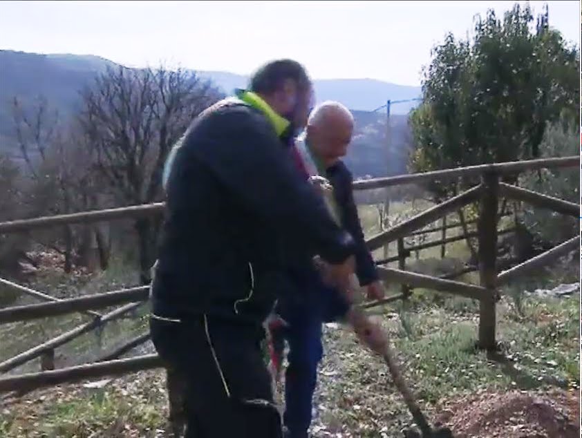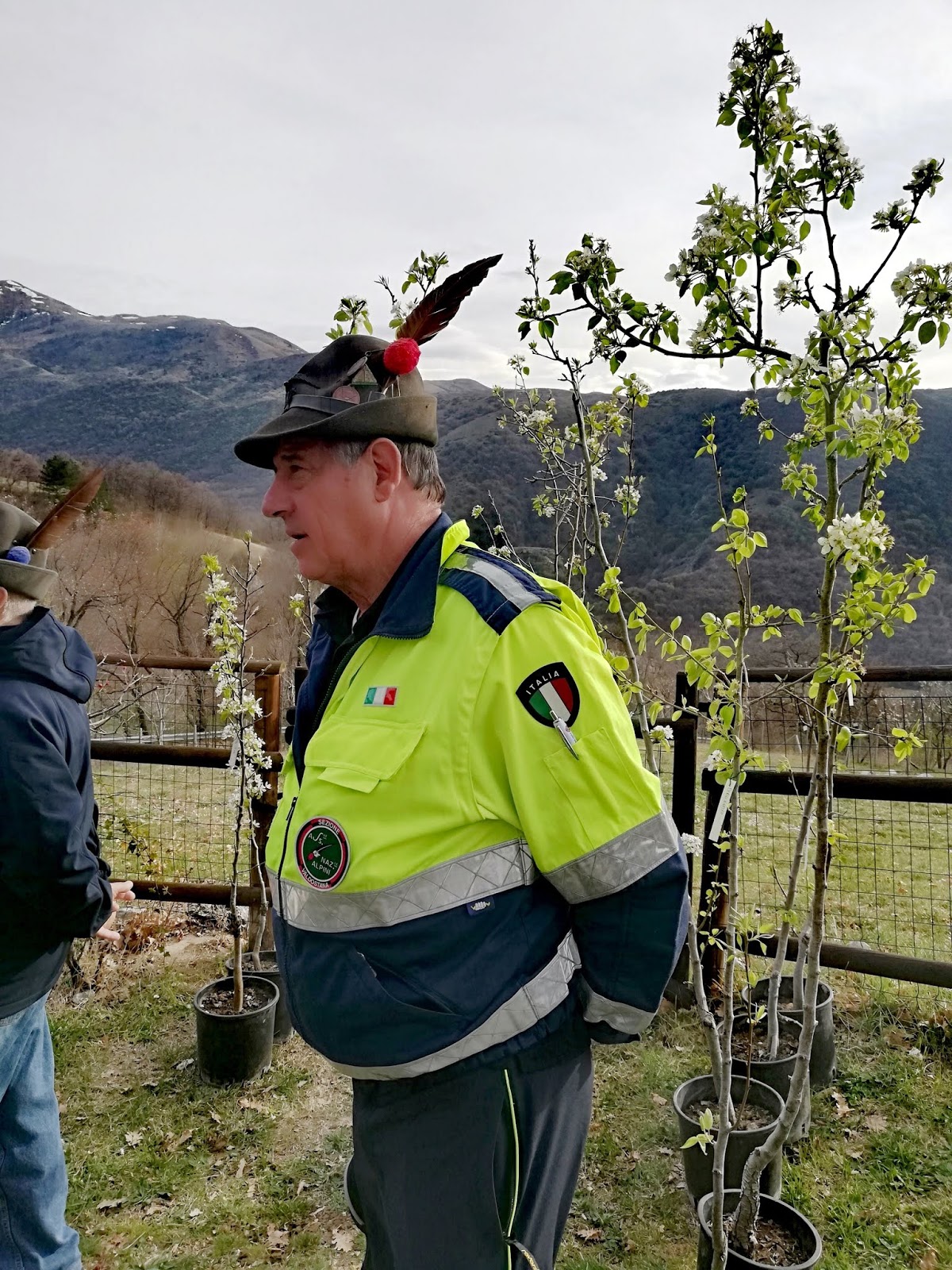 Nel Giardino della Memoria del Sisma di Lucoli c’è una pianta di Pesco dedicata ai volontari della Valle d’Aosta, questa foto illustra la reciproca gratitudine e quanto la piantagione di un albero possa racchiudere significati simbolici.