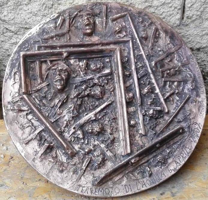 La scultura immortala plasticamente tre sequenze dello scenario del terremoto del 2009. I crolli, i volti di bimbi che dormono, il dolore di una madre che urla, consapevole della tragedia che si sta consumando.