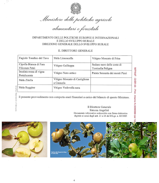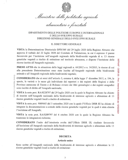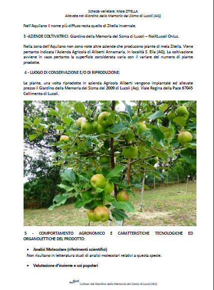 NoiXLucoli Onlus ha presentato i dossier relativi a tre varietà di melo locali in via di estinzione che sono coltivate e perciò conservate nel Giardino della Memoria di Lucoli. La Regione Abruzzo, dopo l’iscrizione nell’anagrafe regionale della biodiversità ha chiesto al Ministero di iscriverle, come abruzzesi, all’anagrafe nazionale (il relativo Decreto Ministeriale è riportato di seguito).