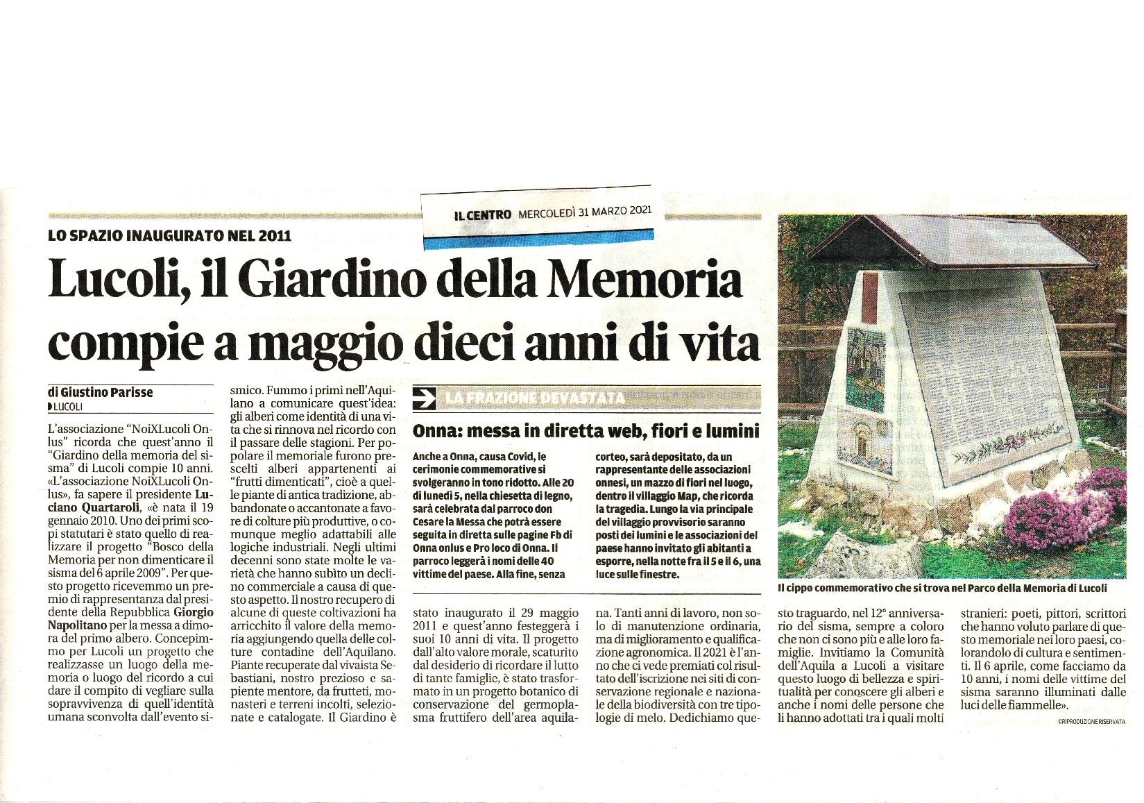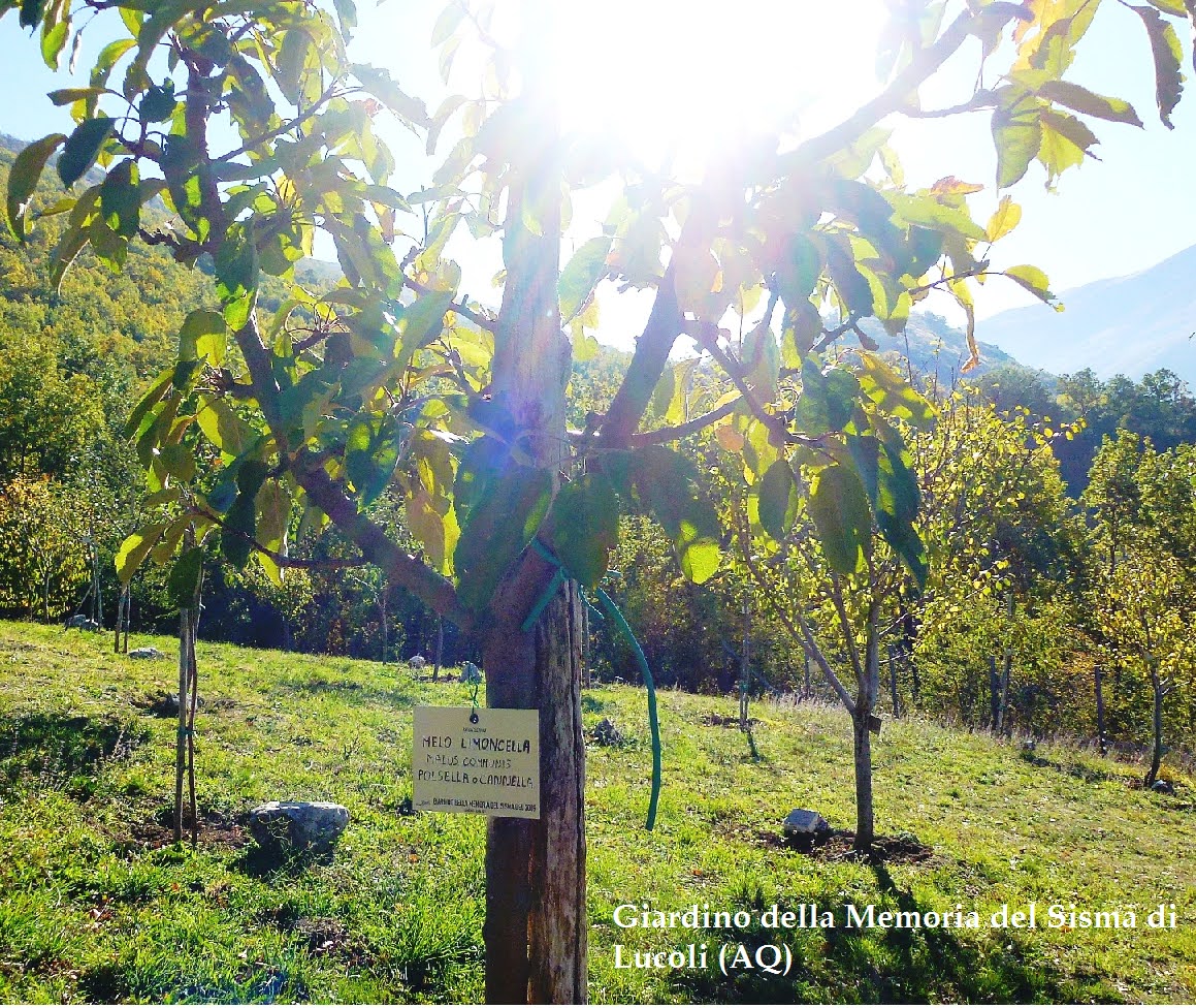 A Lucoli un frutteto di specie antiche, dedicato alla memoria delle vittime del terremoto del 2009, esiste già da dieci anni, impiantato e mantenuto in perfetto stato di vegetazione e cura, con sforzi enormi e senza finanziamenti pubblici, ne siamo orgogliosi e come sempre ringraziamo chi ha creduto in noi, tra questi il Keren Kayemeth LeIsrael di Gerusalemme, nostro partner internazionale nell’ideazione del progetto, tutti coloro che hanno “adottato” gli alberi del Giardino consentendoci di autofinanziarci e naturalmente chi ci ospita: l’Abbazia di San Giovanni Battista di Lucoli. Ringraziamo anche la Regione Abruzzo per l’attenta attività di indirizzo che ci ha fornito per realizzare tutto il lavoro tecnico di istruttoria.